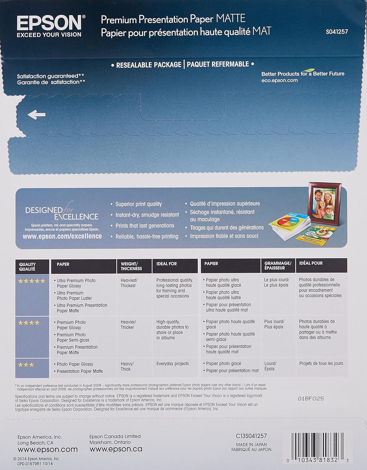 Epson's S041257 heavyweight matte paper is ideal for printing, enlarging, and framing matte-finish photographs. Designed for Epson Stylus Color, Photo, and Scan series printers, each package contains 50 warp-proof 8.5-by-11-inch letter-size sheets.