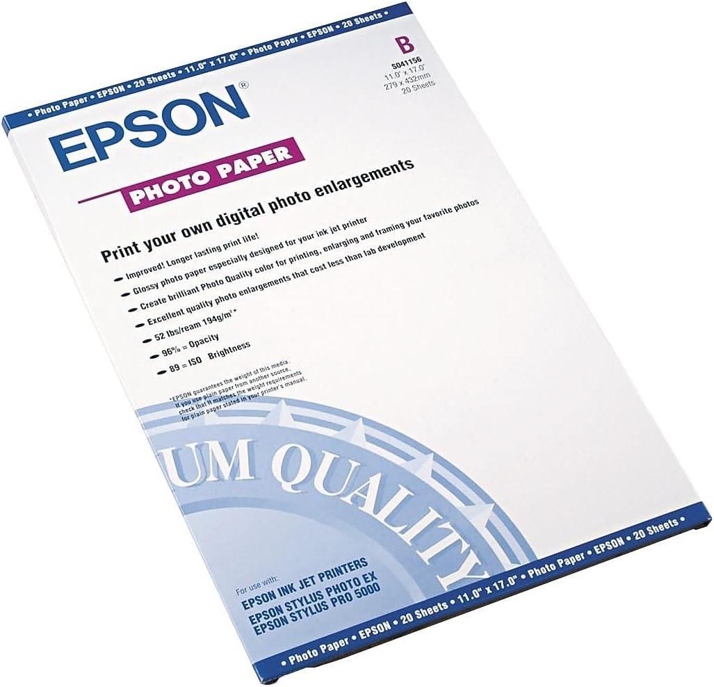 Epson S041156 Glossy Photo Paper, 52 lbs., Glossy, 11 x 17 (Pack of 20 Sheets),White(White)